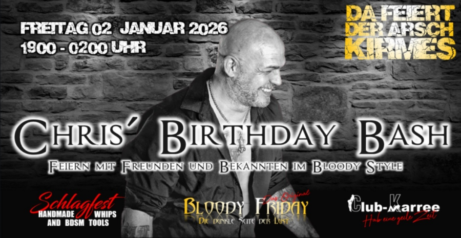 Wieder ist ein spannendes Jahr vergangen, und der BLOODY FRIDAY hat sich zu einem SZENE-EVENT gemausert und feiert seinen Geburtstag! Wir laden wieder alle Freunde und Bekannte herzlich ein, diesen besonderen Anlass gemeinsam mit uns zu feiern und in die fesselnde Welt des BDSM und der Fetische einzutauchen.